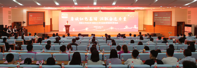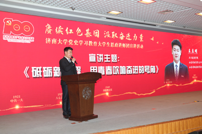 土木建筑学院王立明以《砥砺新征程,用青春吹响奋进的号角》为题,从习近平总书记对青年成长进步念兹在兹出发,呼吁新时代大学生应当立足百年大党新起点,置身百年未有大变局,接力百年奋斗新征程,砥砺前行,用青春吹响奋进的号角;材料科学与工程学院王岩以《跨越时空对话 筑梦青春理想》为题,回顾学校建校70余年峥嵘发展历程和辉煌办学成就,以校史中的红色基因传承和校友们接续创新和奋进为主线,追寻济南大学发展的历史足迹,探寻一代又一代“济大人”镌刻在时光里的红色记忆;文化和旅游学院李鋆洋以《让红色精神放射出新的时代光芒》为题,讲述自己的曾姥爷张冠增跨越战争年代与和平时期“一把手术刀,一颗医者心”的革命故事,以红色家风涵养初心使命,号召用好党百年历史的“活教材”,坚定“功成不必在我,功成必定有我”的信念和决心,让革命薪火代代相传。政法学院齐志良以《最美生涯在军旅,志存高远励青春》为题,回望自己两年军旅生涯最美的岁月和参加国庆70周年大阅兵的无尚荣光,以及退伍复学584天里活跃在新生军训带训、征兵宣传动员一线“退伍不褪色”的军人底色,以其坚定无悔的选择,成就了自己的“大成长”,鼓励更多的青年大学生怀揣从军报国的理想信念,携笔从戎,把爱国之心化为报国之行,在军营这个大熔炉里淬炼成钢。音乐学院穆元炜以《歌声中的党史百年》为题,通过《国际歌》《沂蒙山小调》《唱支山歌给党听》《在希望的田野上》《不忘初心》《骄傲的青年》等红色歌曲,与泉城合唱团共同演绎这些耳熟能详的经典旋律,再现歌曲创作背后一代代音乐工作者镌刻历史记忆、承载时代精神的气概与情怀,以音乐回望党史,用歌声铭记初心。活动最后,全体师生起立同唱《没有共产党就没有新中国》。