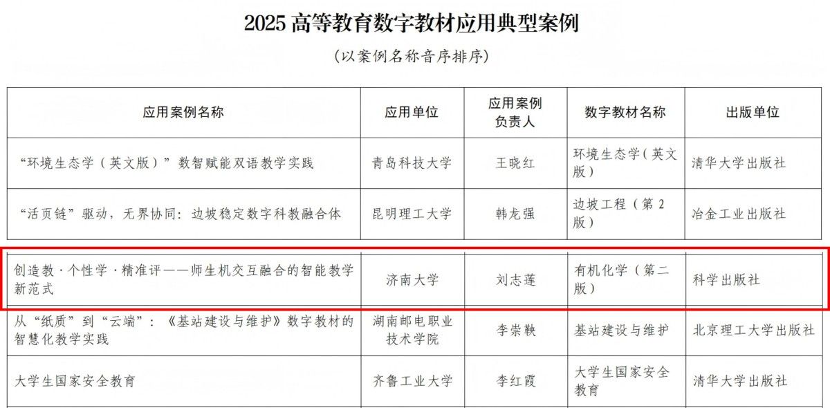 近日,高等教育数字教材创新发展联盟公布了“2025高等教育数字教材应用典型案例”名单。我校化学化工学院刘志莲教授的“创造教·个性学·精准评——师生机交互融合的智能教学新范式”《有机化学(第二版)》数字教材案例成功入选,为数字教材在教学创新中的实践提供了可推广、可复制的宝贵经验。