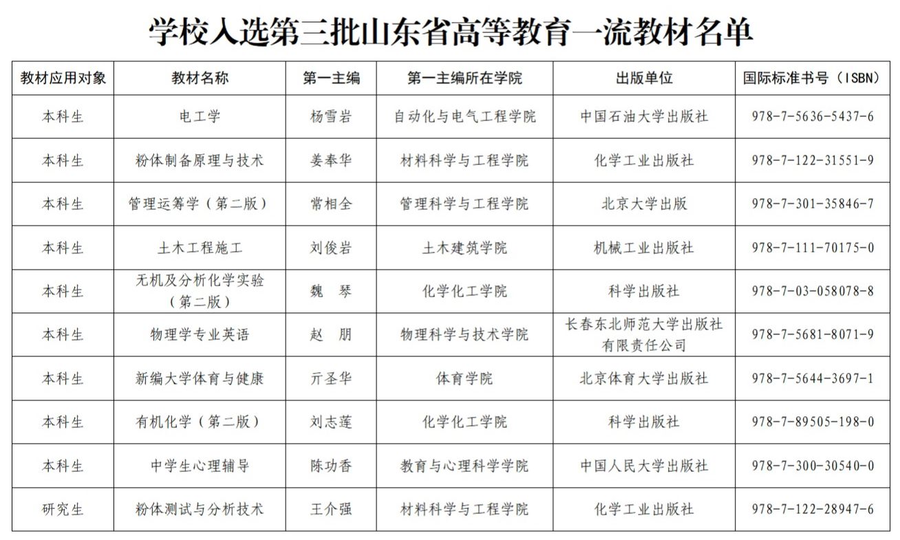 近日,山东省教材委员会办公室发布了《关于公布第三批山东省普通高等教育一流教材名单的通知》,我校共有10部教材入选,其中本科生教材9部,研究生教材1部,入选总数创学校历史新高。
