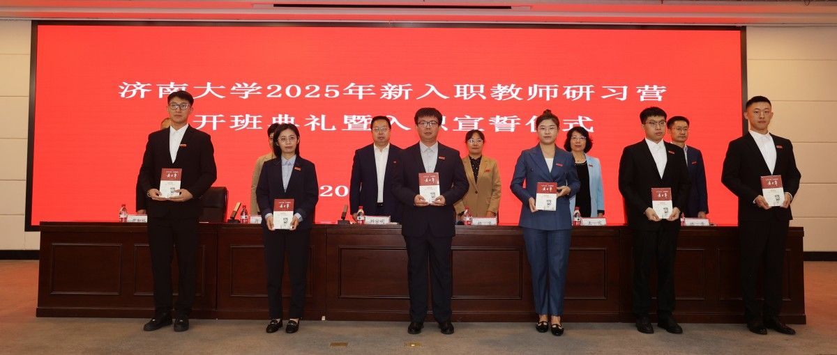 教师是立教之本、兴教之源。10月10日,济南大学2025年新入职教师研习营开班典礼暨入职宣誓仪式在学校第一学术报告厅隆重举行。学校党委副书记、校长刘宗明出席活动并讲话,党委副书记商华,党委常委、副校长王霞,党委常委、副校长黄加栋,党委常委、副校长、组织部部长滕晋,老教师代表、山东省教学名师杨波教授,党委学生工作部(处)、党委教师工作部 教师发展中心、人力资源处、教务处、科技处、社科处、党委研究生工作部等职能部门负责人,各教学学院院长,科研平台负责人出席典礼,与2025年新入职教师齐聚一堂,共同见证这一职业启航的重要时刻。典礼由商华主持。
