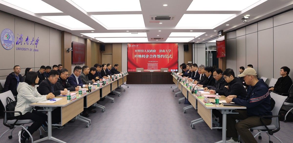 10月24日,济南大学与原阳县人民政府校地校企合作签约仪式在学校第五学术报告厅举行。新乡市人大常委会主任王乐新,原阳县委书记杨新意,原阳县政协主席、县委常委、组织部部长刘为伶,原阳县政府副县长赵彦茹等;济南大学党委副书记、校长刘宗明,党委常委、副校长黄加栋出席活动。新乡市人大常委会、原阳县委组织部、原阳县先进制造业开发区管委会、原阳县商务局、原阳县委办公室等单位相关负责人及部分企业、优秀校友代表,学校科技处、合作发展处、材料科学与工程学院、机械工程学院、土木建筑学院、自动化与电气工程学院等相关部门单位负责同志参加活动。签约仪式由黄加栋主持。