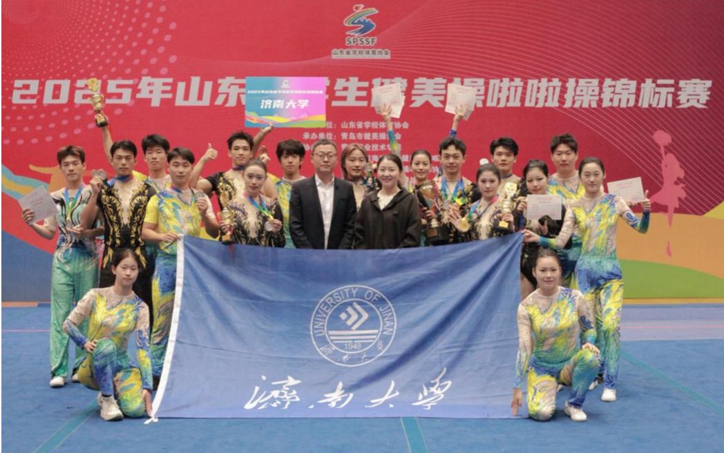 10月24日至26日,2025年山东省学生健美操啦啦操锦标赛在青岛职业技术学院体育馆落幕。济南大学健美操队由体育学院副院长董昱担任领队,戴静、马文基担任教练,凭借扎实的功底与出色的现场发挥,在赛场上斩获佳绩。