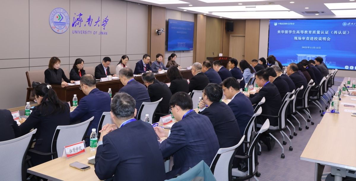 进校说明会上,中国教育国际交流协会原副秘书长周燕对来华留学生高等教育质量认证的背景、意义进行了介绍。她指出,来华留学生高等教育质量认证已列入教育部督导局的教育评价项目清单,是国家来华留学质量保障体系的重要组成部分,是全面评估高校来华留学教育成效的重要指标。希望学校通过本次质量认证,充分发挥来华留学工作效能,进一步筑牢质量保障防线,将特色学科优势转化为国际教育的核心竞争力,形成“留学济大”的独特价值。认证专家组组长、哈尔滨师范大学国际教育学院院长张晓涛介绍了现场审查的工作内容和要求。他表示,认证小组将恪守纪律、廉洁自律,遵循客观公正原则和专业精神,严格执行认证规则标准、全面采集信息并提出建设性意见,以确保认证结果的客观性、专业性和权威性。刘宗明对专家组的到来表示热烈欢迎,他强调,学校将以此次再认证为契机,以评促建、以评促改,不断优化来华留学教育质量与管理体系,推动国际化办学迈向更高水平。黄加栋代表学校向专家组汇报了学校来华留学教育整体情况。