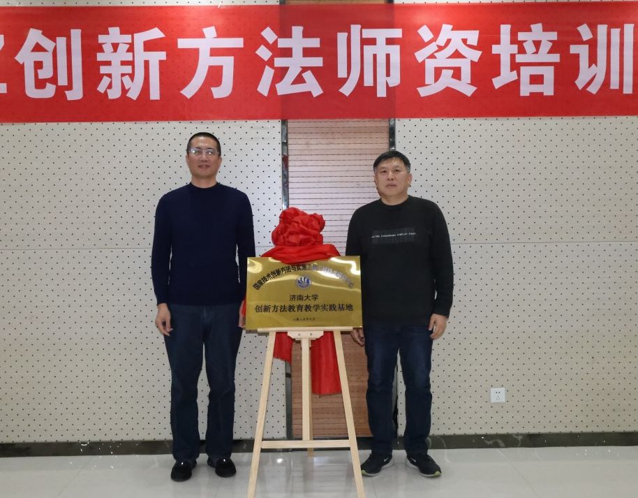 仪式上,曹国忠与高常青为国家技术创新方法与实施工具工程技术研究中心济南大学创新方法教育教学实践基地揭牌。