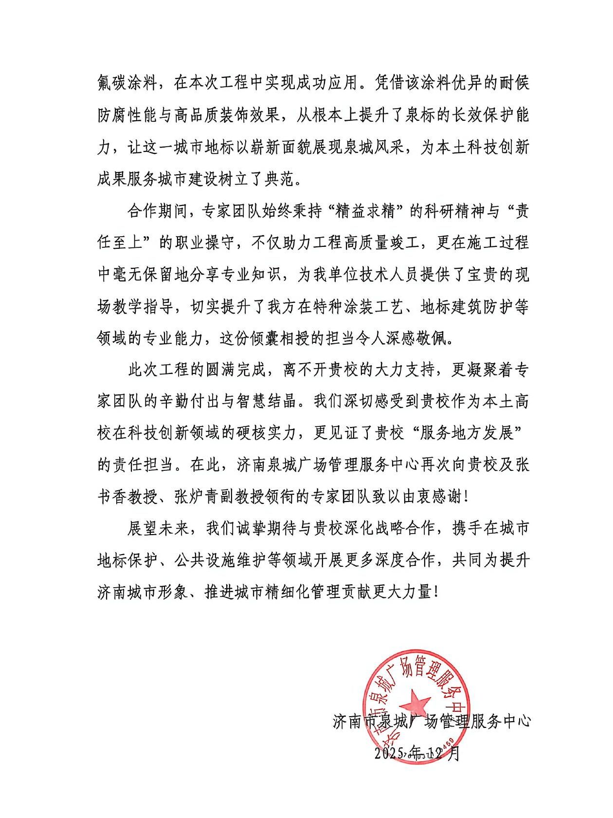 如今,泉标以焕然一新的姿态重新屹立于泉城广场,济南大学化学化工学院的蓝色氟碳涂料,已悄然化为守护城市文化记忆的科技铠甲。这封感谢信的背后,是济南大学与泉城济南的双向奔赴、共生共荣,更是济南大学践行“学科赋能产业、科研服务城市”使命的生动实践。未来,济南大学将继续以学科建设为龙头,以科研创新为核心,带动更多团队扎根地方、服务地方,让更多“科技之花”在地方发展的土壤中绽放,为校地合作书写更多精彩篇章。