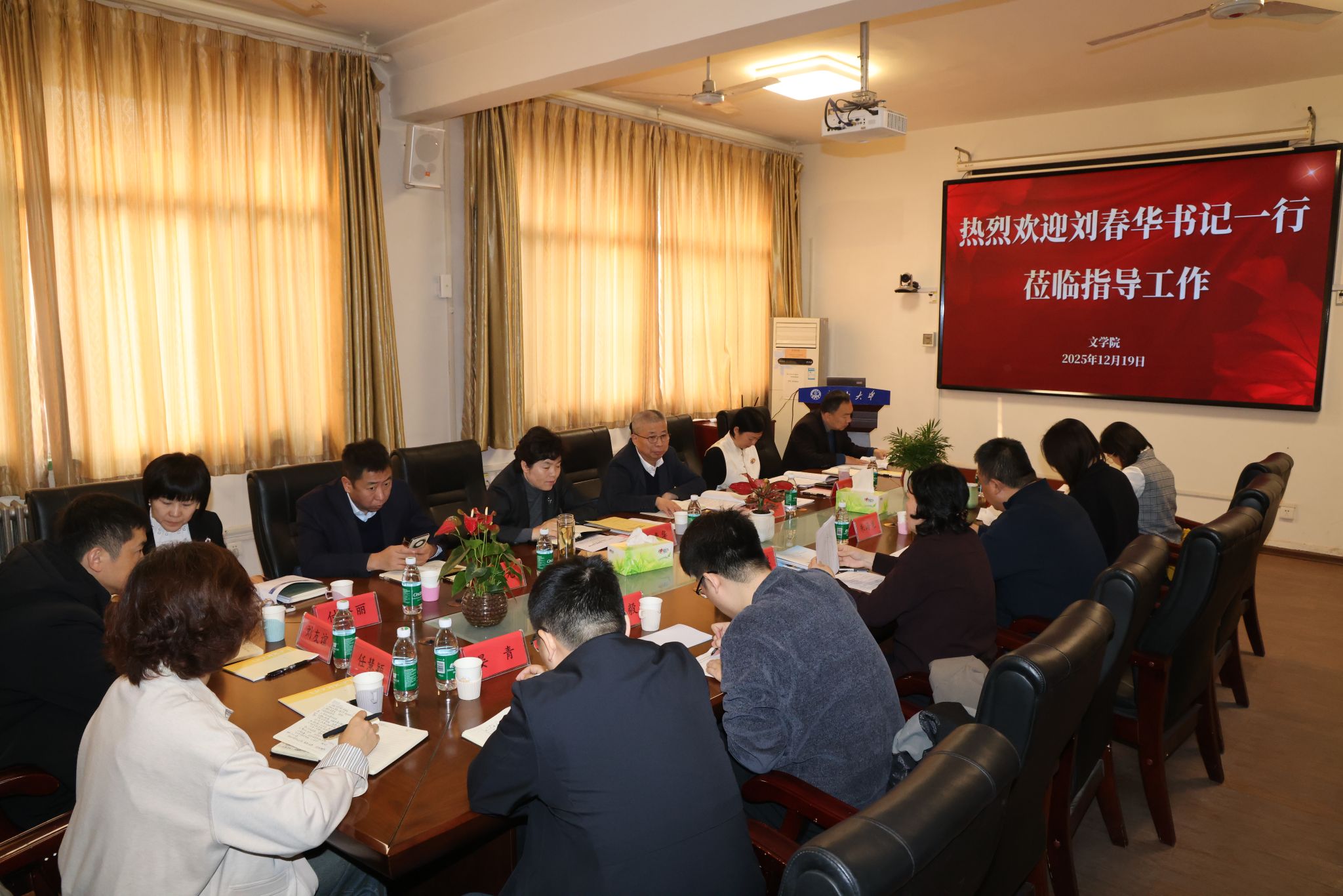 12月19日上午,学校党委书记刘春华到文学院调研并召开座谈会。副校长徐征和,学校办公室、人力资源处、发展规划与学科建设处、社科处、研究生院等职能部门负责同志,以及学院领导班子全体成员参加座谈。