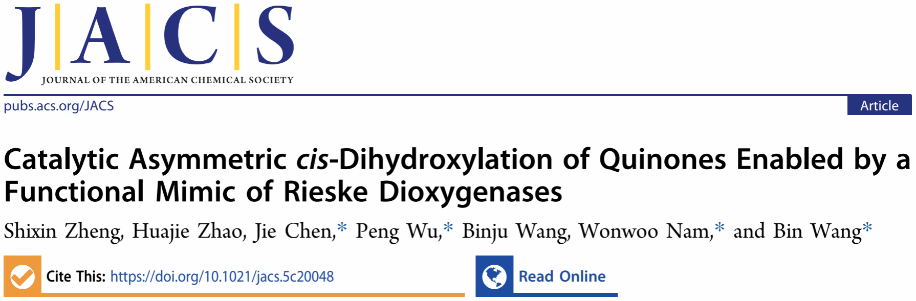 近日,我校化学化工学院王斌教授课题组在化学领域权威期刊《美国化学会志》发表题为“Catalytic Asymmetric cis-Dihydroxylation of Quinones Enabled by a Functional Mimic of Rieske Dioxygenases”的研究论文(J. Am. Chem. Soc. 2026, https://doi.org/10.1021/jacs.5c20048)。该研究模仿自然界金属酶的催化机制,首次实现了非血红素锰配合物催化醌类化合物的不对称顺式双羟化反应,为手性邻二醇类化合物的高效合成提供了绿色新策略。