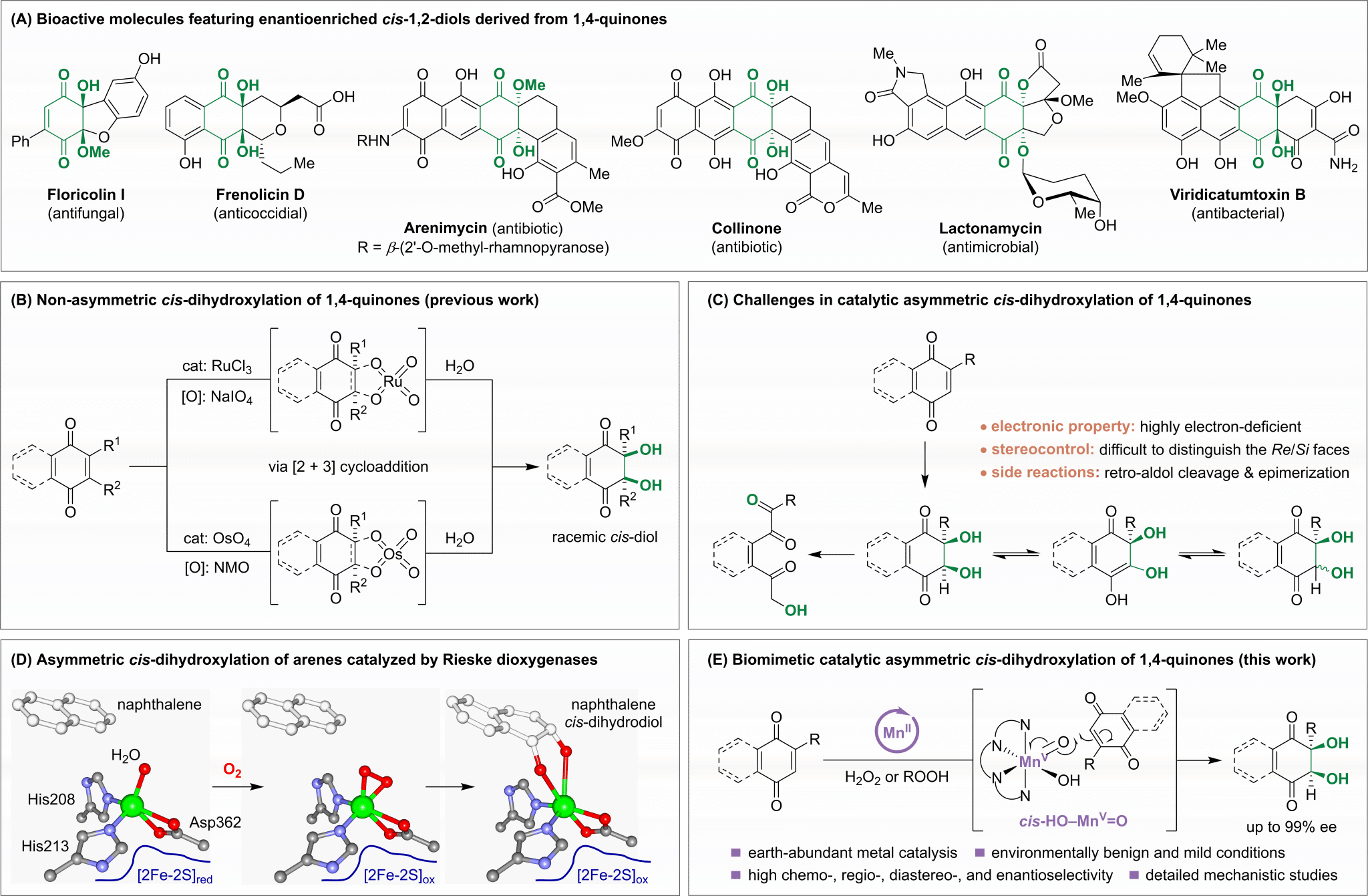手性顺式-1,2-二醇是一类重要的化学结构单元,广泛存在于具有抗肿瘤、抗菌等生物活性的Ⅱ型聚酮天然产物和药物分子中(图1A)。不对称顺式双羟化反应虽是合成该类结构最直接的途径(图1B),但对醌类化合物长期难以奏效。传统Sharpless不对称双羟化等方法面临四大瓶颈(图1C):醌类底物电子缺乏导致C=C双键反应活性低;平面结构对称性强,阻碍手性催化剂有效识别;生成的顺式-1,2-二醇易发生差向异构化;产物对逆羟醛裂解敏感。这一挑战制约了相关天然产物和药物的合成研究。