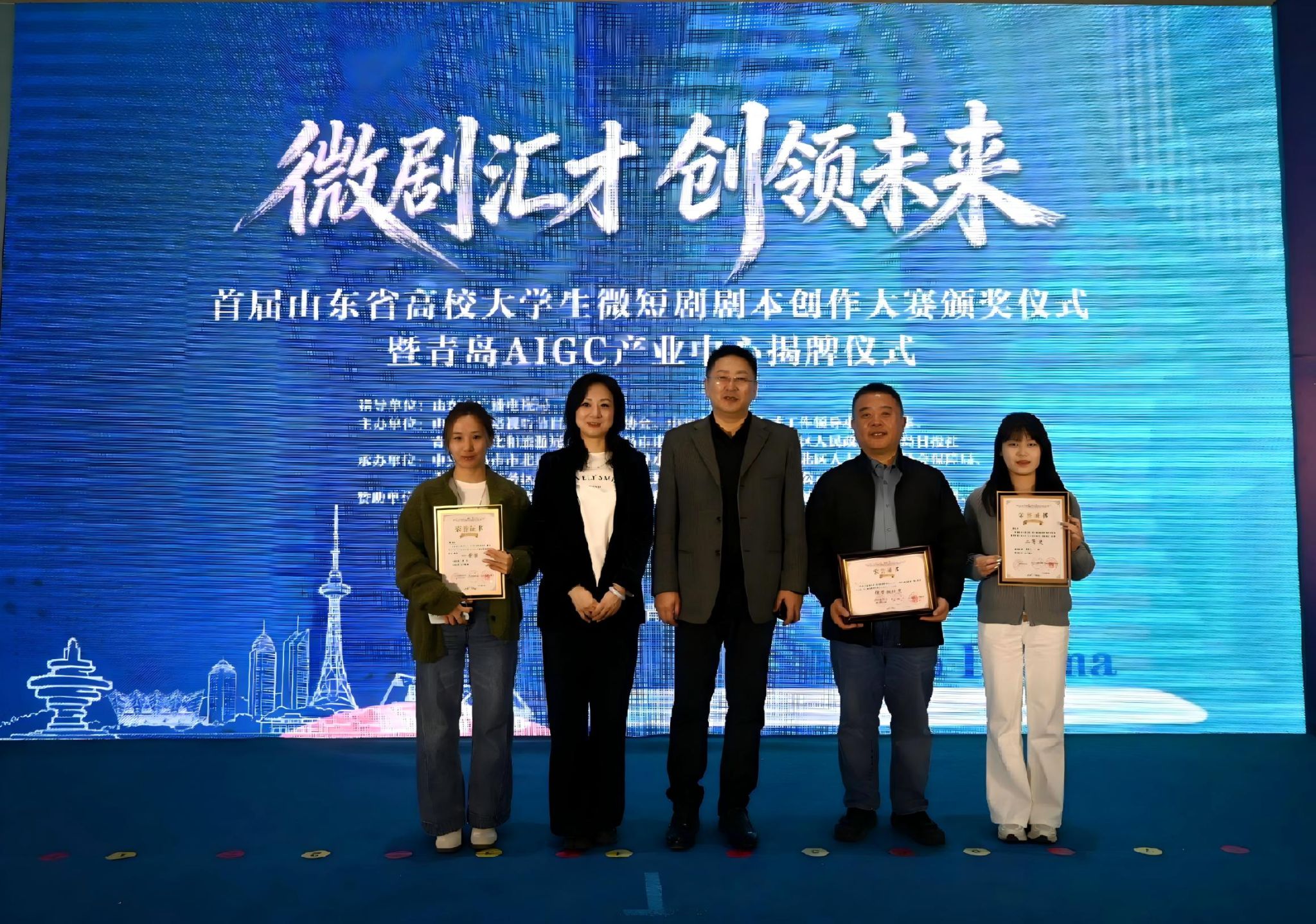 3月27日,“微剧汇才 创领未来”首届山东省高校大学生微短剧剧本创作大赛颁奖仪式在青岛举行,济南大学荣获优秀组织奖,文学院学生获得二等奖2项、三等奖1项、优秀奖1项。学校党委常委、宣传部部长卢旺带队赴青岛参加颁奖仪式,文学院党委书记朱海龙,文学院党委副书记、副院长潘颖等一行参加活动。