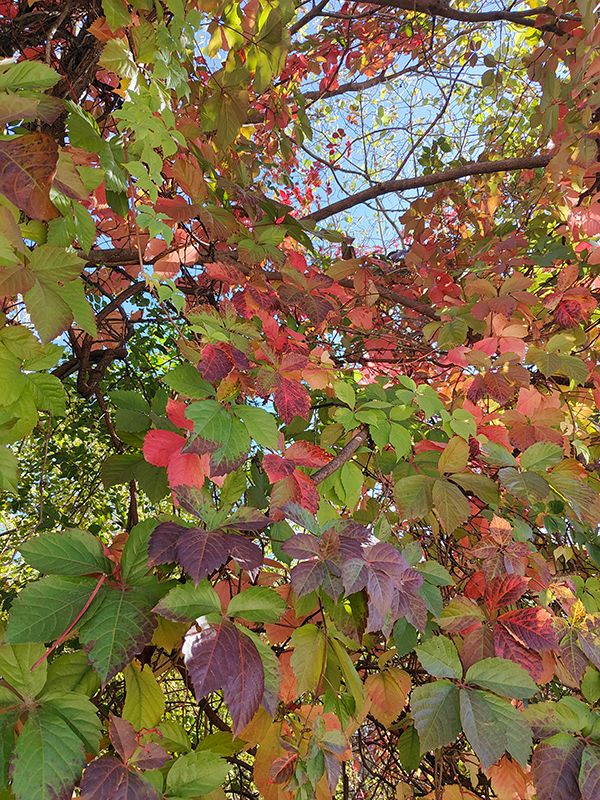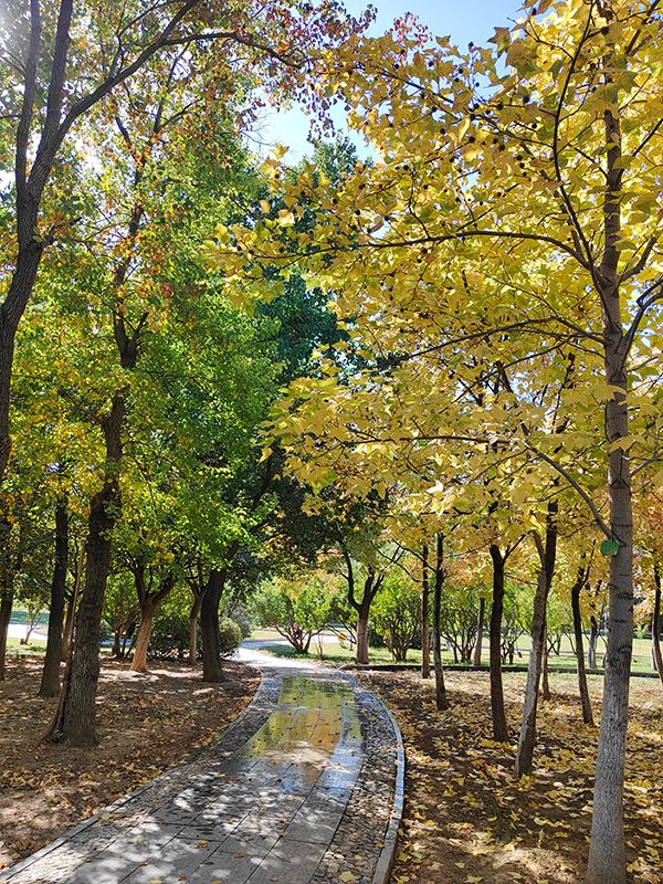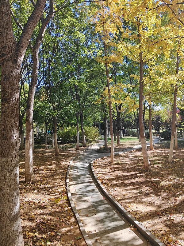 滋兰苑开始变得金黄,绿中带黄的枝叶,红红绿绿的果实含着笑出现在眼前。一片片银杏林,在风中化作点点碎金翻飞空中,又齐齐整整铺在小路上,便也成了金光之道,路过的人们不舍得下脚,只留下窄窄的边供人行走。