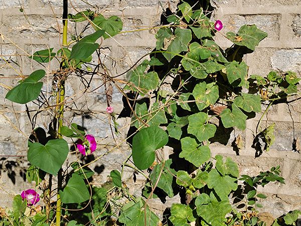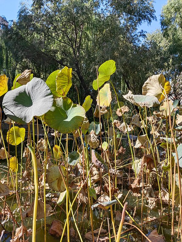 荷塘已败,卷边的荷叶、光溜溜的荷杆昂首朝天。校友捐赠的石榴树,如今灯笼似的果实挂在树下。甲子湖下游,附近人家种着红红的辣椒,黄黄的豆子紫色的喇叭花,就着阳光在河堤边上晒着。